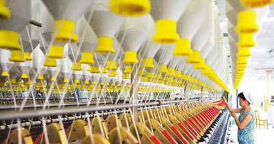 10月21日的江西九江一家紡織廠的工人在紡紗 張海巖攝(新華社發(fā))