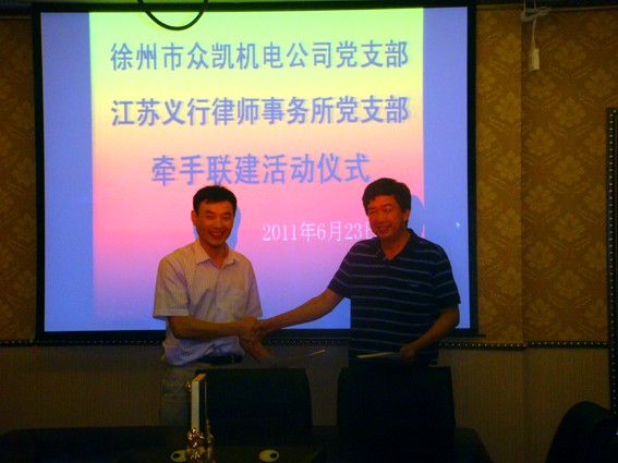 在喜迎中國共產黨成立90周年之際,徐州眾凱公司黨支部成員王總和江蘇義行律師事務所黨支部戴書記于623分別代表各自黨支部,喜簽黨建共建協(xié)議,結成共建單位。并進行座談交流。