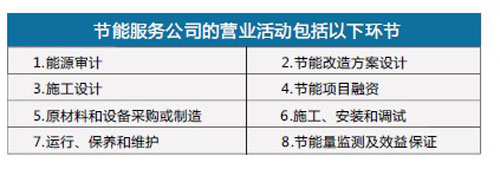 《合同能源管理技術(shù)通則》第3.3條,對節(jié)能服務(wù)公司的定義是,“提供用能狀況診斷、節(jié)能項目設(shè)計、融資、改造(施工、設(shè)備安裝、調(diào)試)、運行管理等服務(wù)的專業(yè)化公司!睆亩x看,節(jié)能服務(wù)公司的營業(yè)活動包括以下環(huán)節(jié):
