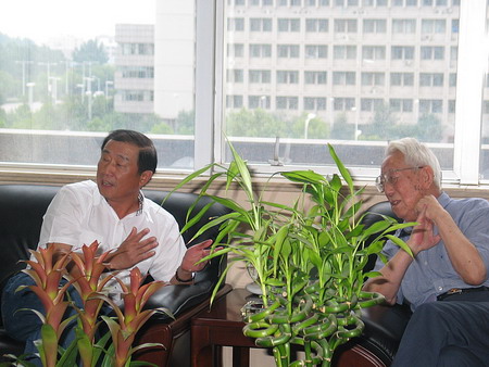 參觀完院區(qū),周昌貢總經(jīng)理一行看望了朱尊權(quán)院士和袁行思老院長(zhǎng)。一見到來自湖南的客人,朱老就關(guān)切地詢問湖南煙葉的種植情況并向他們表達(dá)了要在煙田建車間的愿望。周昌貢總經(jīng)理很欽佩朱老能在耄耋之年依然關(guān)心煙草農(nóng)業(yè)生產(chǎn),并表示如果朱老的建議能被采納,愿意將湖南中煙下屬的某個(gè)煙葉生產(chǎn)基地作為朱老這一創(chuàng)新想法的第一塊試驗(yàn)田。
