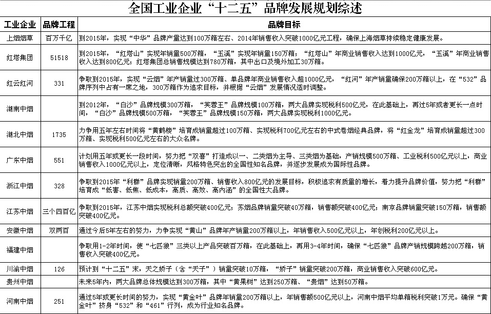 全民運動、人人參與。很顯然,“卷煙上水平”并不是一場只屬于少數(shù)強(qiáng)勢工業(yè)企業(yè)的強(qiáng)者游戲,和某些一刀切的改革手法不同,532、461以目標(biāo)的形式引領(lǐng)著改革的方向,而不是當(dāng)作一道門檻將相當(dāng)一部分企業(yè)拒之門外。更重要的是,此舉最大限度地保護(hù)了這部分企業(yè)的積極性,也充分調(diào)動了全行業(yè)的積極性和良性的競爭氛圍。在今年的全國煙草專賣局長、總經(jīng)理座談會召開之前,已有三分之二以上的工業(yè)企業(yè)發(fā)布了“十二五”品牌發(fā)展規(guī)劃,目標(biāo)直指532、461。同時,我們注意到,鑒于532、461所設(shè)定的品牌指標(biāo)已經(jīng)遠(yuǎn)遠(yuǎn)超越了企業(yè)層面的資源配置,優(yōu)勢工業(yè)企業(yè)頻頻出擊,主動尋求下一步發(fā)展的合作對象,而弱勢企業(yè)亦沒有坐等待靠,積極接洽、全面參與到這場“卷煙上水平”的全民運動中。