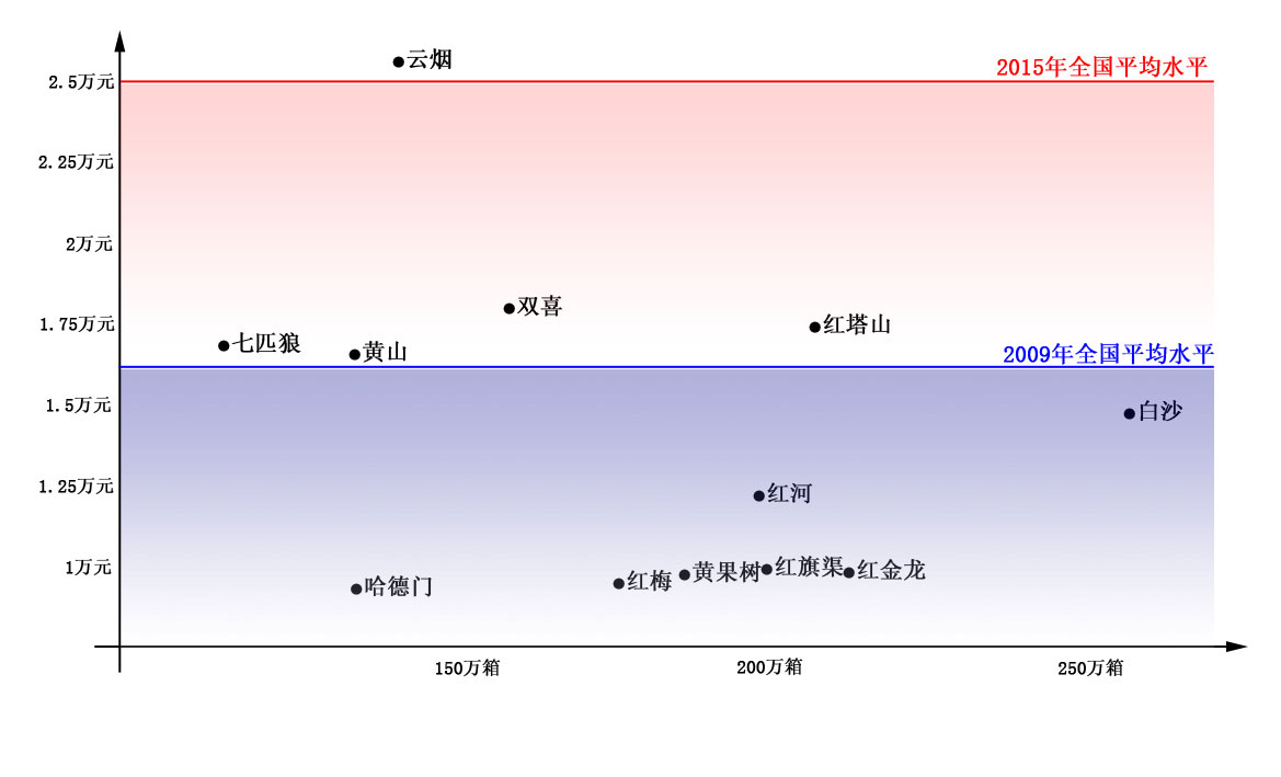 結(jié)構(gòu)問題才是根本。在2009年的12個百萬箱品牌中,僅有云煙、雙喜、紅塔山、七匹狼、黃山等5個品牌商業(yè)單箱批發(fā)均價高于全國平均水平,其中又只有云煙屬于結(jié)構(gòu)、規(guī)模協(xié)調(diào)發(fā)展,雙喜、紅塔山、七匹狼、黃山的單箱批發(fā)均價也僅是略高于全國平均水平,且結(jié)構(gòu)增幅遠(yuǎn)低于全國平均水平,幾個品牌的產(chǎn)品線布局主要以三類煙為主,輔以少量一、二類煙,七匹狼、黃山兩個品牌還有相當(dāng)比重的四類煙。其余7個百萬箱品牌商業(yè)單箱批發(fā)均價明顯低于全國平均水平,特別是“十二五”期間寄望于實現(xiàn)500萬箱、300萬箱銷量的白沙、紅河、紅金龍,結(jié)構(gòu)問題已經(jīng)成為影響品牌下一步發(fā)展的主要制約因素。同時,根據(jù)目前全國卷煙消費水平推算,預(yù)計到2015年前后,全國卷煙單箱批發(fā)均價有望達(dá)到2.5萬元水平,按照這樣一個增長預(yù)期,規(guī)模型品牌在未來3-5年還需要保持至少兩位數(shù)的結(jié)構(gòu)增幅。