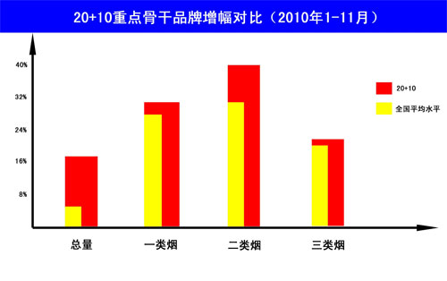 上述政策措施的組合效應(yīng)以重點品牌的快速發(fā)展得以集中呈現(xiàn)。今年1-11月,以20+10重點骨干品牌為代表的優(yōu)勢品牌、強勢品牌保持了較為強勁的增長勢頭,增量、增幅均高于全國平均水平。從數(shù)據(jù)上看,20+10重點骨干品牌的總量增幅高于全國平均水平近15個百分點,市場比重已近六成;20+10重點骨干品牌的一類煙、二類煙、三類煙增幅也分別高出全國平均水平3%、7%、2%左右,并分別占據(jù)了超過90%、80%、80%的市場份額。一方面,“大品牌”表現(xiàn)出了遠超過其它品牌的發(fā)展態(tài)勢和增長水平;另一方面,“大品牌”在市場上的主導(dǎo)作用也進一步凸顯,占據(jù)了舉足輕重的重要地位。