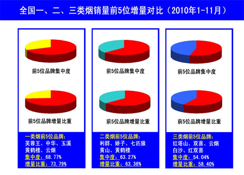 另一方面,按照經(jīng)濟學(xué)家巴萊多提出的二八定律,百分之二十的品牌或產(chǎn)品占據(jù)著百分之八十的市場份額,以現(xiàn)時全國120多個的品牌數(shù)量,占據(jù)絕大部分市場份額的將會是不到30個品牌,但實際上,留給那些百分之二十以外品牌的市場空間越來越狹窄,超過百分之八十的品牌正在搶奪不到百分之二十的市場份額。1-11月,一類煙銷量前5位品牌芙蓉王、中華、玉溪、黃鶴樓、云煙的市場集中度已經(jīng)超過68%,增量比重也已占據(jù)七成以上;二類煙銷量前5位品牌利群、嬌子、七匹狼、黃山、黃鶴樓的市場比重、增量比重雙雙超過63%;三類煙銷量前5位品牌紅塔山、雙喜、云煙、白沙、紅雙喜的市場集中度、增量比重雖然相對略低,但同樣雙雙占據(jù)半壁江山。